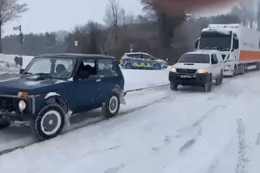 Посмотрите, как «Нива» буксирует фуру в ледяную гору в Германии
