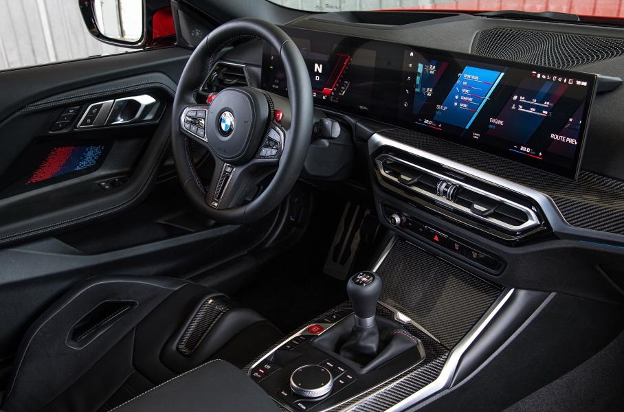 В салоне BMW M2 без сюрпризов: всем купе положен цифровой кокпит с 12,3-дюймовым дисплеем виртуальных приборов, 14,9-дюймовым тачскрином мультимедиасистемы iDrive 8 и встроенной навигацией. За спортивные сиденья, гоночные ковши, проекционный экран, обогрев руля, беспроводную зарядку для гаджетов и поддержку eSIM 5G нужно доплачивать.