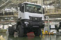 Машина полной массой 25 тонн оснащена 390-сильным дизелем и 12-ступенчатым «роботом».