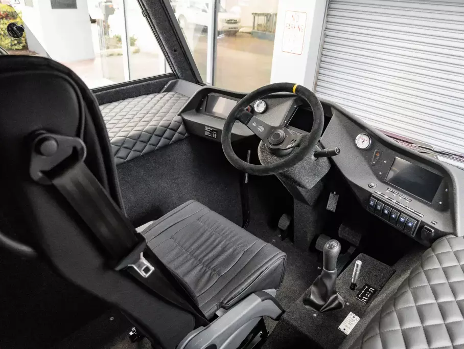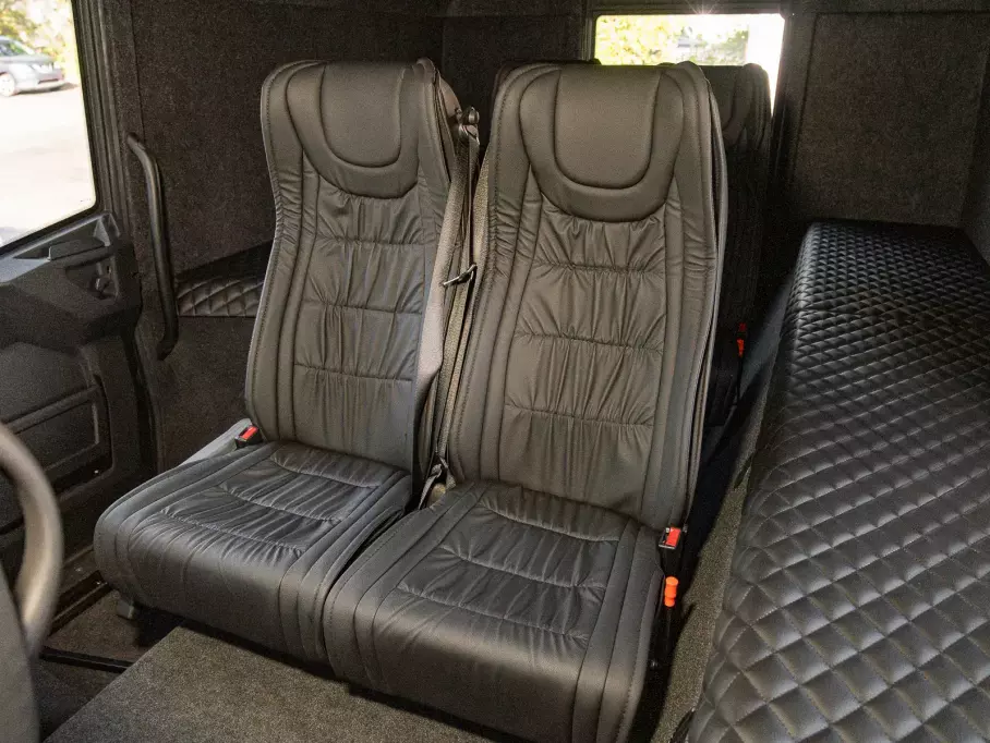 Водительское кресло расположено по центру, в салоне три ряда сидений. Из полезных опций — блокировки переднего и заднего дифференциалов, насос для откачки воды и автоматическая система подкачки шин.