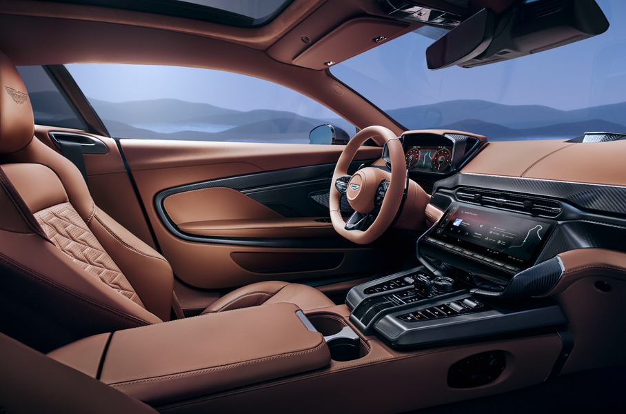 Двухместный салон с обивкой из алькантары и полуанилиновой кожи на выбор напоминает оный у Vantage и DB12. В оснащении — 10,25-дюймовая цифровая «приборка» и экран мультимедийной системы такого же размера. Акцент сделан на водительском месте, где можно установить сиденье Performance из углеродного волокна с низкой посадкой. За звук отвечает система Bowers & Wilkins с 15 динамиками. За доплату салон украсят деревянными вставками.