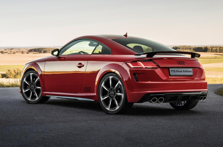 Финальные двухдверки красят только в три «металлика»: Tango Red, Glacier White и Chronos Grey. Отличительные черты спецверсии — 20-дюймовые колеса, красные тормозные суппорты, черные эмблемы и декор. В салоне — расширенная отделка натуральной кожей, руль с нулевой отметкой, обитые алькантарой сиденья и красные акценты на передней панели. Вдобавок на TT Final Editions штатно стоит медиасистема MMI Navigation Plus с предоплаченным на 3 года доступом к онлайн-сервисам. А на TTS Final Edition — аудиосистема Bang & Olufsen, парктроники и камера заднего вида.