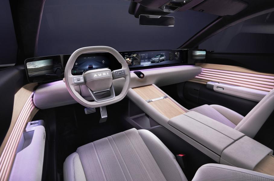 Дизайн — тоже с прицелом на предпочтения китайцев. Внешний минимализм соседствует с традиционными эстетическими кодами внутреннего убранства, в котором приоритет отдан комфорту и современным технологиям. Так, на центральной консоли есть места для двух смартфонов, перед водителем и пассажиром — изогнутый 4K-дисплей во всю ширину передней панели. Мультимедиа концепта работает на AUDI OS, поддерживает ИИ-аватар AUDI Assistant и управляется через тач-панель AUDI Control. Материалы отделки салона: подсвеченный деревянный шпон и микрофибра. Интересно, что AUDI E демонстрирует не одну, а сразу три модели новой марки. По всей видимости, выполнят их в едином ключе, но относиться они будут к разным сегментам: B и C.