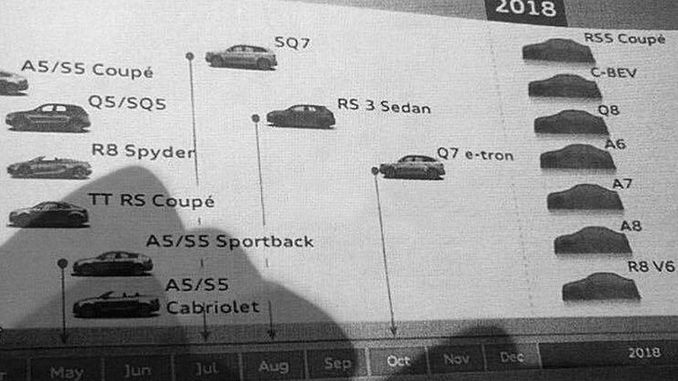 В 2018 году, кроме R8 с двигателем V6, Audi собирается выпустить модели A6, A7 и A8 следующего поколения и совершенно новый кроссовер Q8. Разработку последнего немецкая марка подтверждала неоднократно.