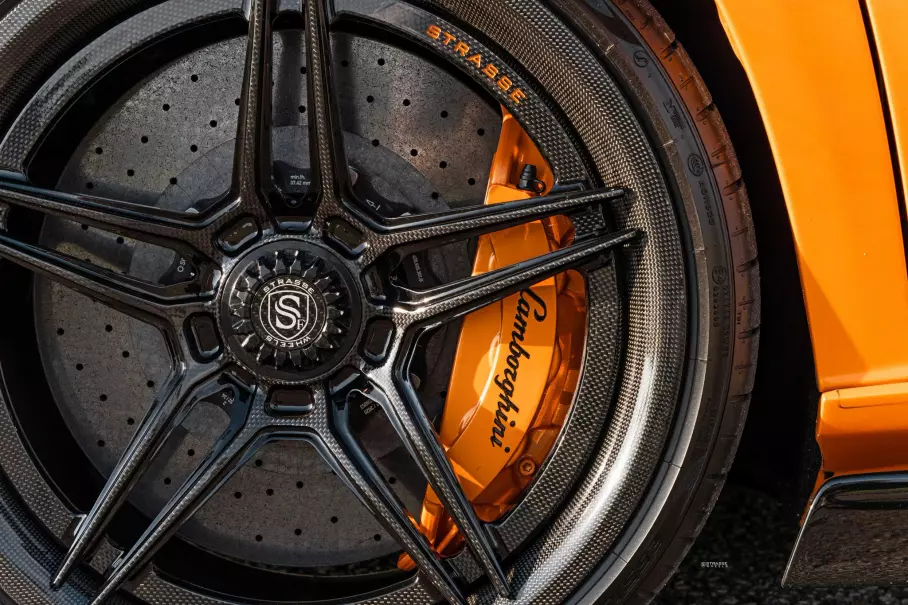 Диски из лакированного углепластика имеют фирменные логотипы Strasse, сделать которые предложено в цвет кузова — владелец первой машины выбрал себе оранжевые эмблемы. Стоимость карбоновых дисков для Lamborghini Aventador SVJ в компании не называют, но охотно готовы предоставить эту информацию потенциальным покупателям.