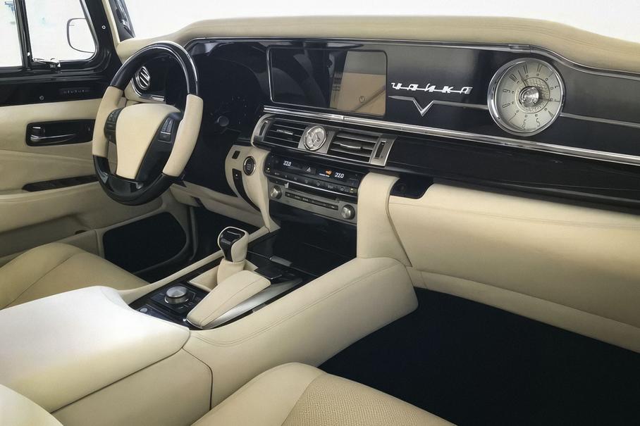 От той же японской модели рестомоду досталось оформление интерьера. В салоне «Чайки» появился белый кожаный салон, мультимедийная система с ЖК-дисплеем, современный селектор переключения передач, а также мультируль, климат-контроль и функция запуска двигателя с кнопки.