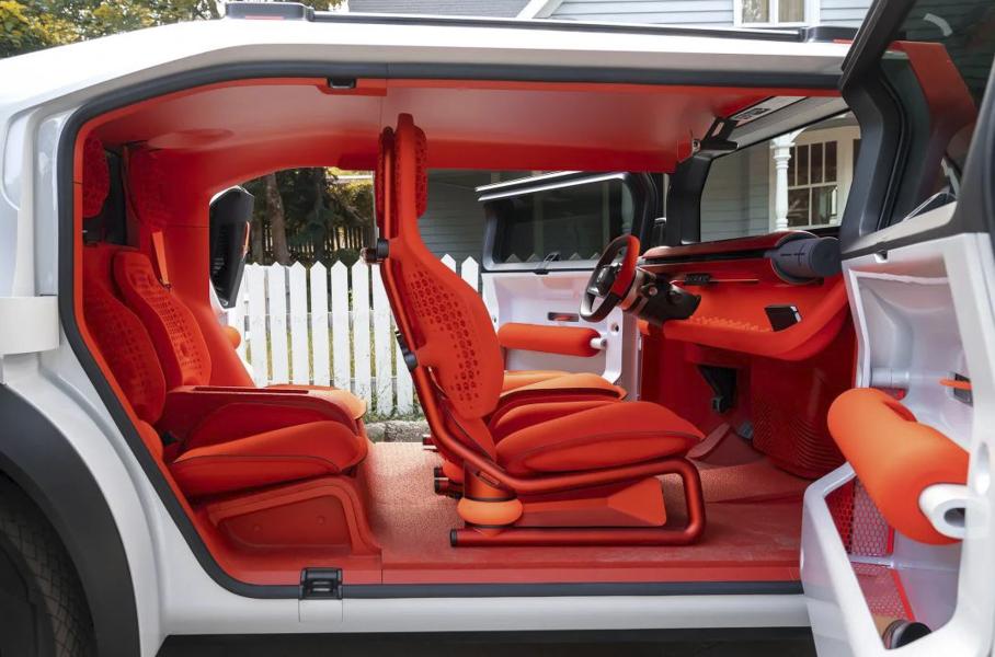 Сиденья в салоне изготовлены с применением технологии трехмерной печати. В них используется на 80 процентов меньше деталей, чем в обычных креслах, а потому они меньше весят. Передняя панель обошлась без гигантских дисплеев, тренду на которые некоторые дизайнеры прочат скорый конец. Имеется ряд физических переключателей, упрощенный руль и тонкий дисплей-приборка, к которому можно подключиться со смартфона. За звук отвечают съемные Bluetooth-динамики по бокам.