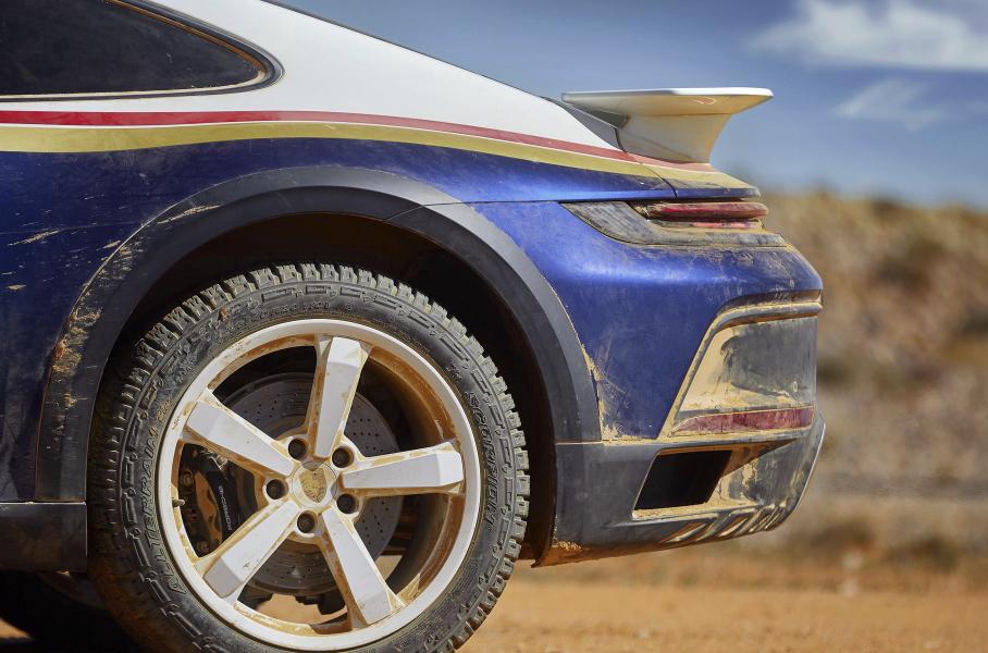 Всего компания выпустит 2500 модифицированных спорткаровДизайн Porsche 911 Dakar выполнен в сине-белой гамме, которую дополняют красные полосы, проходящие вдоль бортов. Такая же цветовая комбинация украшала автомобиль, победивший в ралли-рейде «Париж-Дакар» в 1984 году. Всё это часть опционального пакета Rallye Design Package, и без него 911 Dakar выглядит более традиционно. Экстерьер дополнен багажником на крыше со встроенной светодиодной оптикой (предлагается за доплату), буксировочными проушинами и защитными сеткам на воздухозаборниках.