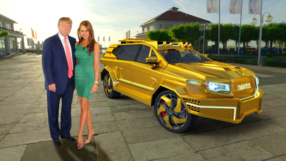 Латвийская компания задумала создать автомобиль для 45-го президента СШАКомпания Dartz Motorz распространила изображения, дающие представление о том, каким бы мог получиться автомобиль для Дональда Трампа. На снимке изображен 45-й избранный президент США вместе со своей женой, а также позолоченный внедорожник.