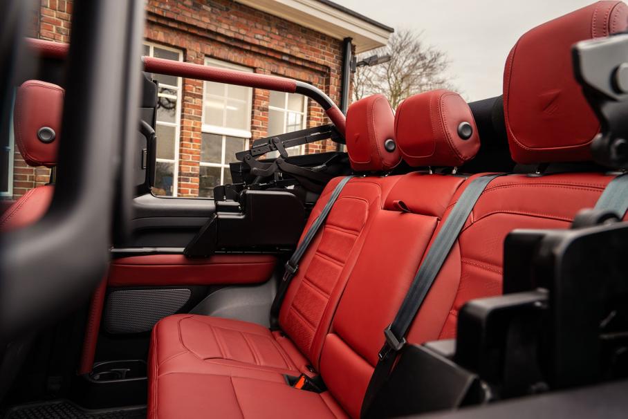 В этом конкретном проекте каркас и тент выполнены в чёрном цвете, который местами отделан бордовой кожей, как и весь интерьер. Стандартные колёса заменили чёрными стальными штампованными дисками от Heritage Customs.