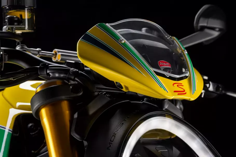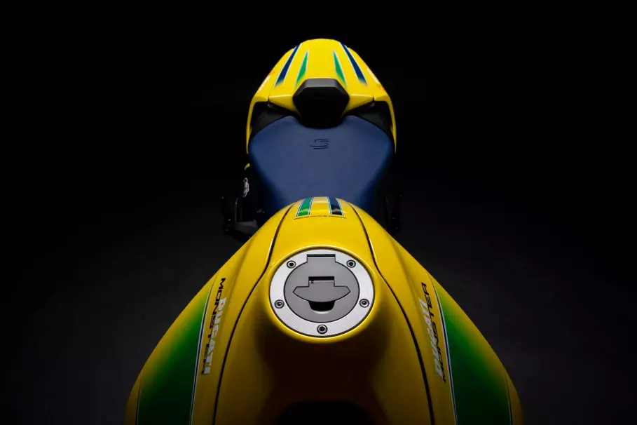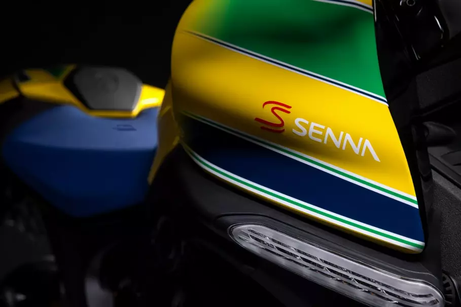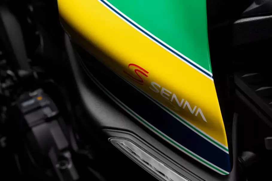 Помимо окраски байк получил яркие акценты на колёсах, синее сиденье, уникальная табличка с серийным номером и специальная анимация запуска на 4,3-дюймовом дисплее цифровой панели приборов. Естественно, мотоцикл несёт на себе массу логотипов Айртона Сенны.