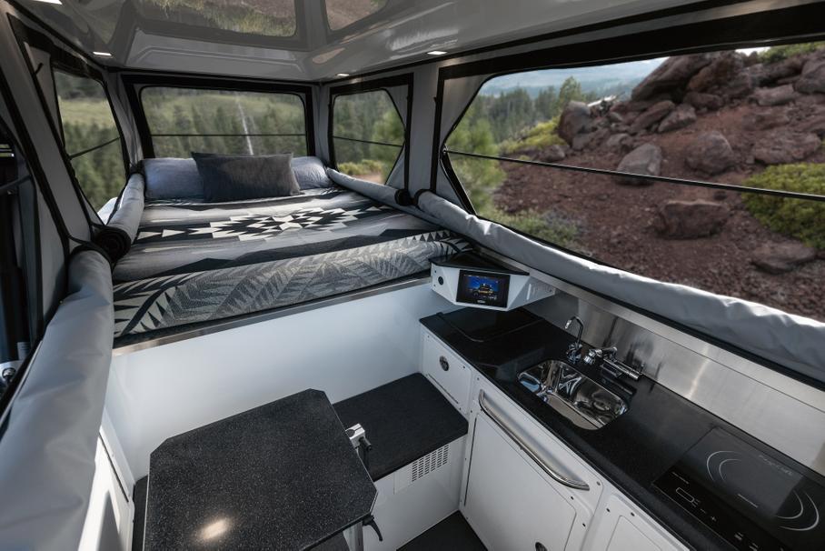 За счёт того, что модуль устанавливается поверх крыши автомобиля, двуспальная кровать оказывается на ней и не отнимает места в жилом отсеке. В оснащение включены набор бытовой техники, душ, розетки на 120 и 12 вольт, специальное место для хранения вещей и даже встроенный туалет.