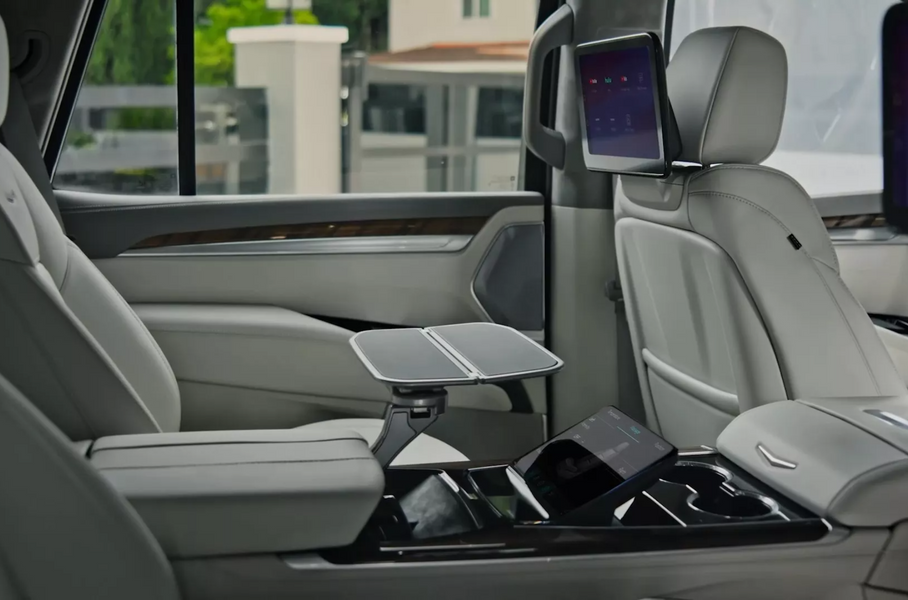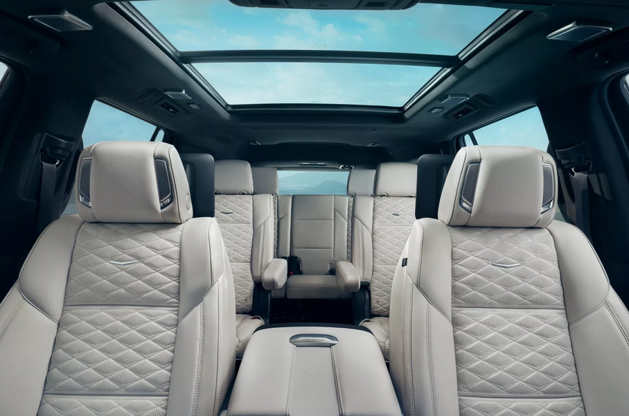 Отделанный новыми материалами салон можно сделать еще комфортнее, докупив пакет Executive Second Row. В него входят центральная консоль для задних пассажиров, два 12,6-дюймовых дисплея, два отсека для беспроводной зарядки, выдвижные столики и массажные кресла с динамиками в подголовниках. Всего динамиков 19, но можно увеличить их число до 40. Интерьер «горячего» Escalade-V дополнен деталями из углеволокна и эксклюзивными сиденьями.