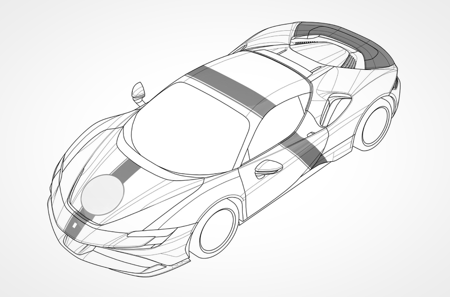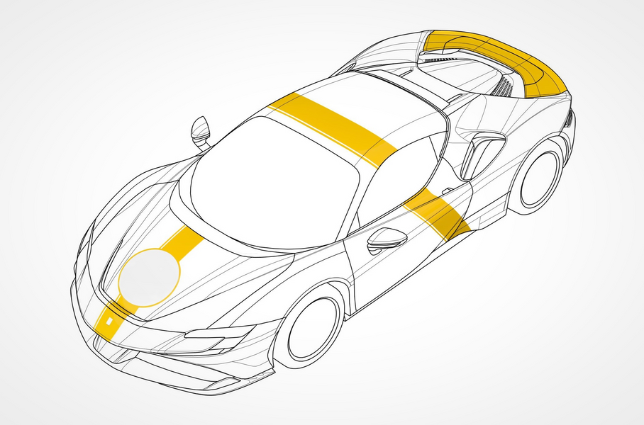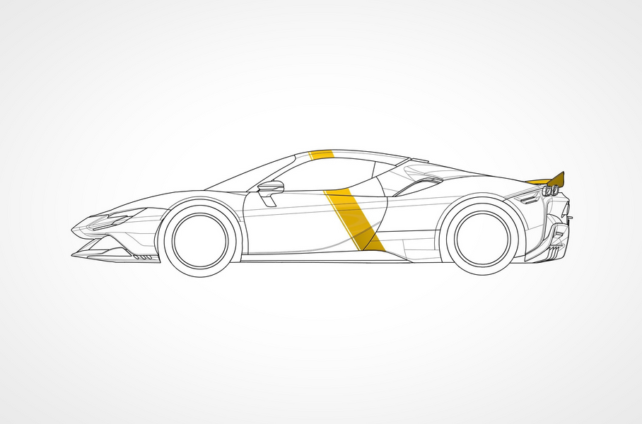 Он изображен в ливрее желтого и синего цветовСуперкар изображен в двух вариантах ливреи, которые, судя по всему, различаются только цветами. У SF90 Stradale полоса по центру капота с кругом для гоночного номера и еще одна полоса на крыше и дверях. Им вторит окрашенное в тот же оттенок антикрыло.