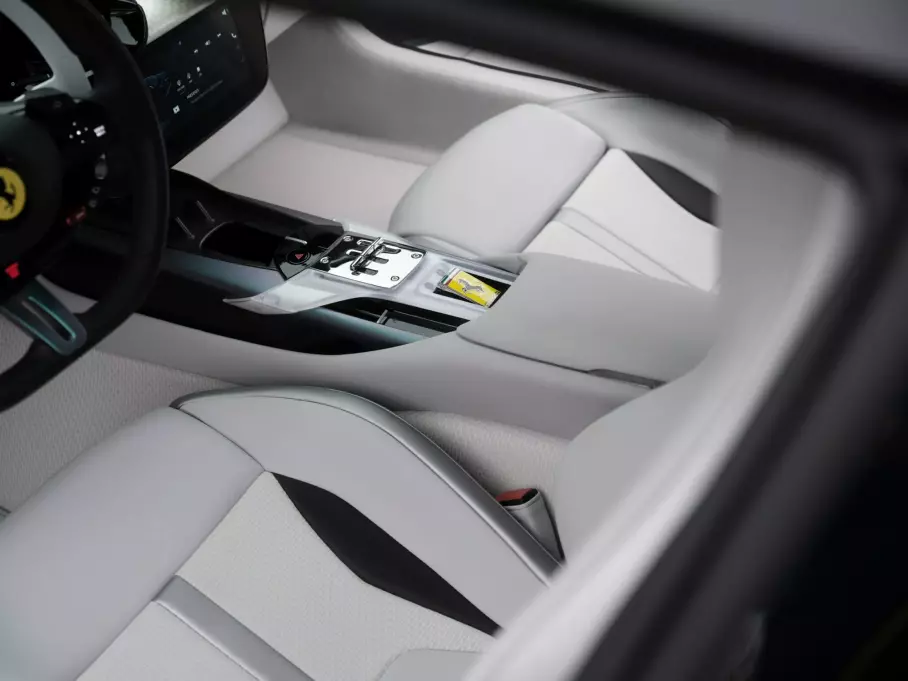 Самая интересная деталь находится в салоне: в отделке приборной панели использован конский волос. Материал поставлялся от производителей, сертифицированных Торговой палатой Кореи. В интерьере также применена инновационная 3D-ткань, разработанная южнокорейской компанией, что для Ferrari стало новым опытом. Даже панорамная крыша получила особый рисунок, создающий сложную игру света и теней.