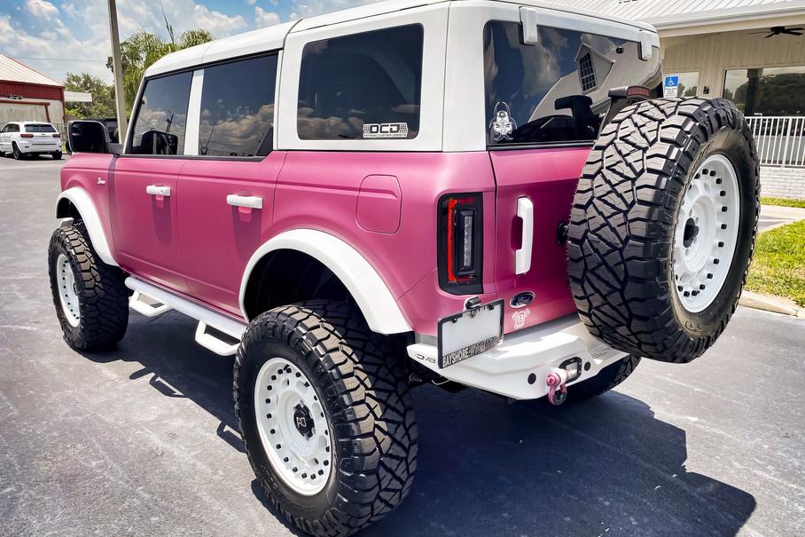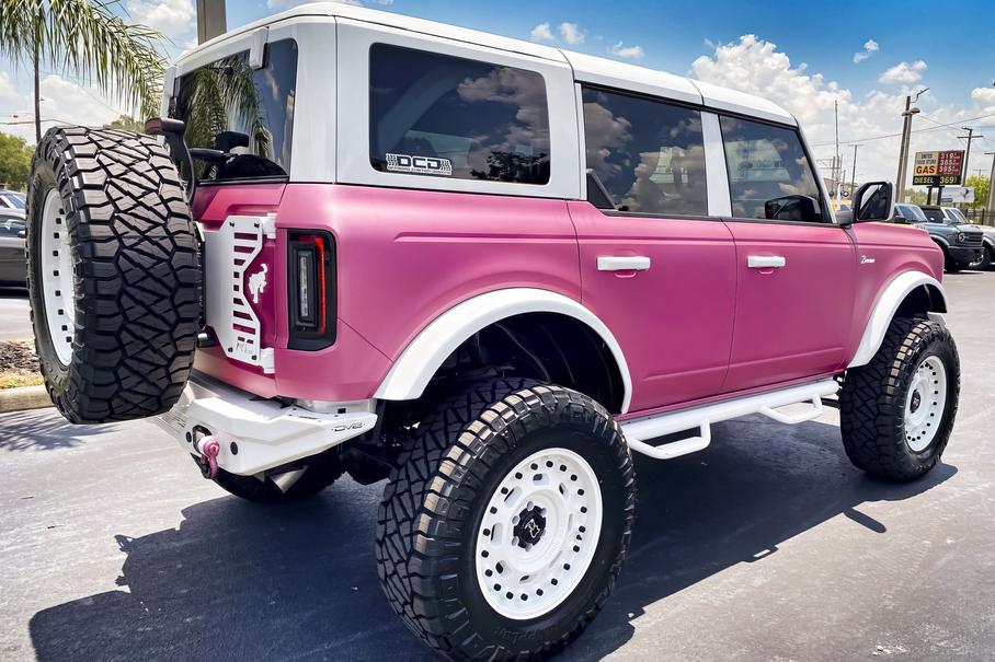 При этом модель сохранила свои внедорожные характеристикиПомимо розовой отделки кузова и белого кожаного салона, Bronco оборудовали силовыми бамперами, накладками на порогах, а также 20-дюймовыми колесными дисками с грязевыми покрышками и расширителями арок. Кроме того, внедорожник получил дополнительные световые приборы в переднем бампере и головную оптику, меняющую цвет.