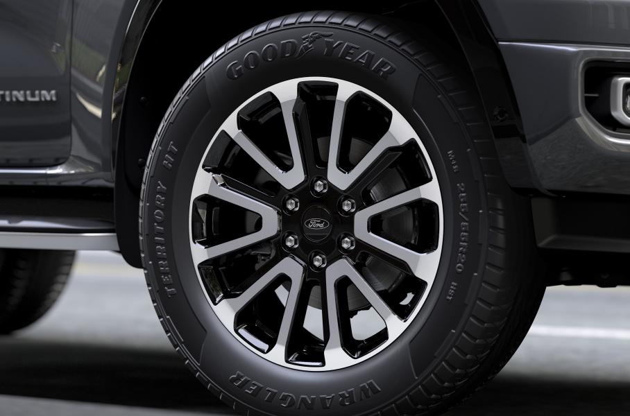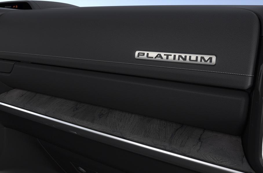 От других Ranger версия Platinum отличается дизайном решетки радиатора и декором «матовый хром». Фары уже «в базе» матричные. Кроме того, пикап оснащен доводчиком дверцы грузовой платформы, 20-дюймовыми колесами со шлифованной поверхностью и глянцевыми черными «карманами», а также рейлингами. Салон отделан перфорированной и стеганой кожей, декоративные вставки — из темного кленового шпона с крупнозернистой текстурой.