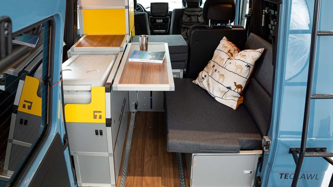 При этом внедорожник не стал хуже по своим характеристикамКомпания подготовила модульный тюнинг-кит, который позволяет конвертировать внедорожник в кемпер. При этом все детали устанавливаются на штатные места и не требуют доработки кузова, так что при необходимости Mercedes-Benz G-Class TecCrawl можно легко превратить в обычный «Гелендваген» — и обратно.