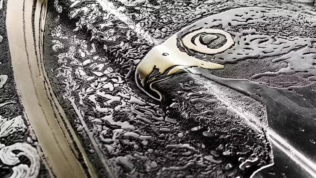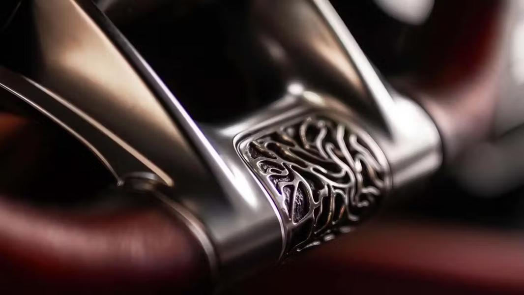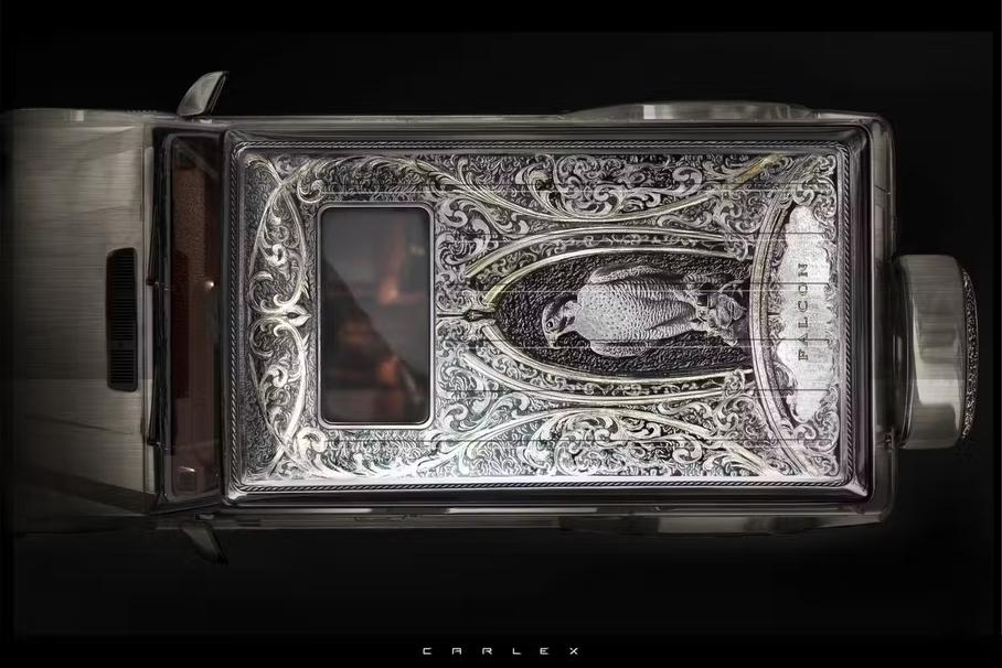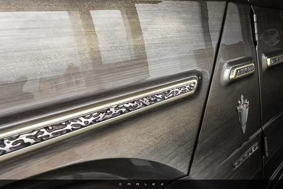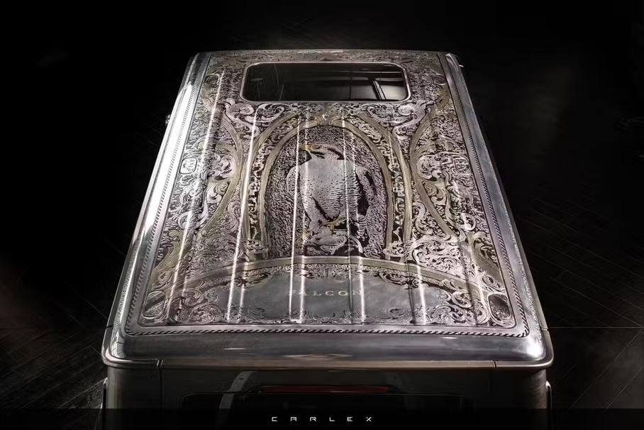 Рисунок выполнен полностью вручнуюГлавная особенность внедорожника — крыша, на которой вручную выгравировано изображение сокола в лесу. Ещё больше гравировки можно увидеть на боковых молдингах и колёсных арках, где используются декоративные узоры, а также контраст полированного металла с вкраплениями золота, которые подчеркивают — тоже эксклюзивный! — янтарный цвет кузова.