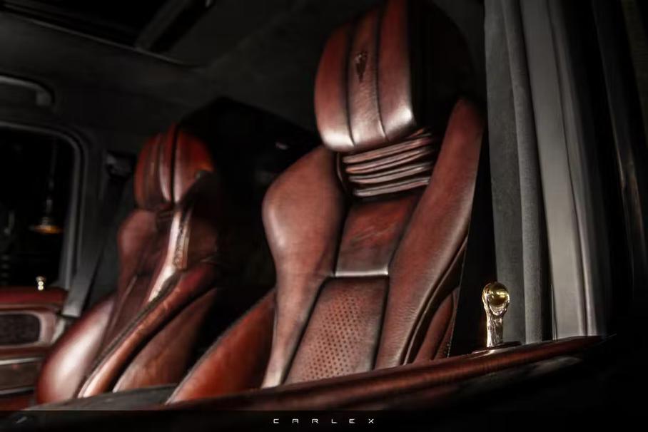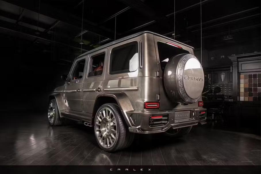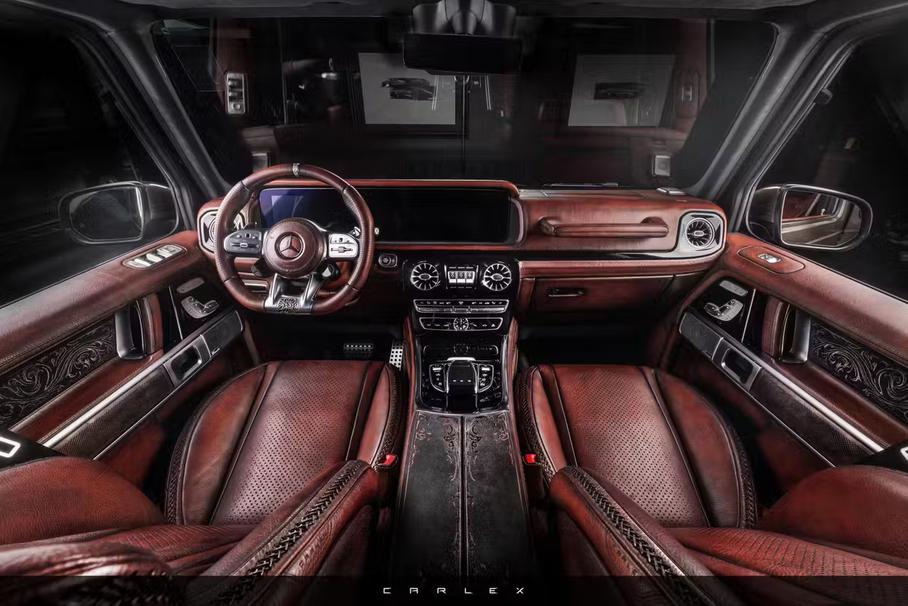 Интерьер получил отделку патинированной кожей тёмно-коричневого оттенка, тщательно прошитой вручную. Кожа покрывает почти всё — от сидений до приборной панели и всех окружающих их деталей. А всё, что не покрыто кожей, украшено ручной гравировкой, как на кузове. Технически Mercedes-AMG G 63 не изменился, сохранив штатный 585-сильный 4,0-литровый бензиновый турбомотор V8 и 9-ступенчатый автомат.