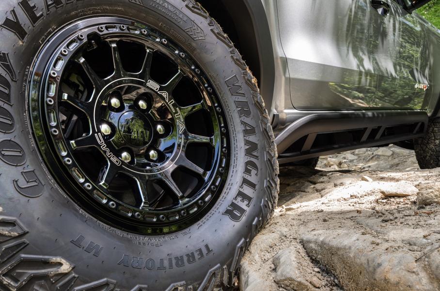 Грузовичок оборудован силовыми бамперами AEV и совместимыми с бедлоками колесами Salta. У него расширенные арки, кронштейн под запаску в кузове и здоровенные 35-дюймовые шины. В салоне — дополнительный блок кнопок для вспомогательного оборудования.