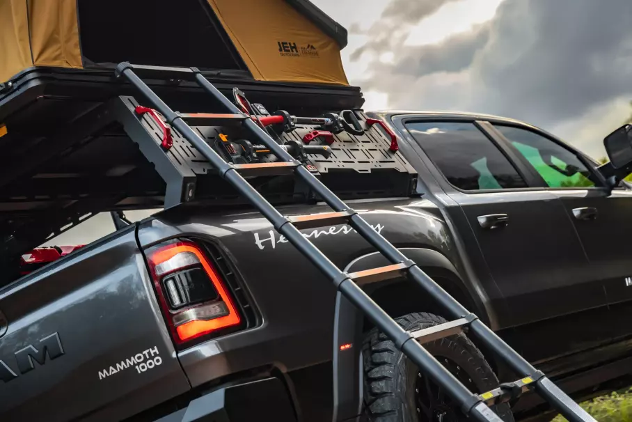 «Мамонт» получил туристический аксессуарМодуль в грузовой отсек включает в себя установленную над крышей раскладную палатку Nimbus, выдвижной полутораметровый тент-маркизу, под ними размещены дополнительный топливный бак и ёмкость для хранения воды. Для доступа к спальному месту предусмотрена раскладная лестница.