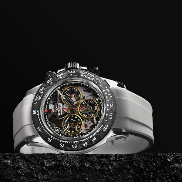 Безель у хронографа углепластиковый, а не керамический, как на оригинальных Cosmograph Daytona. Тахиметрическая шкала позволяет измерять среднюю скорость до отметки в 400 километров в час. Закручивающие кнопки тактильно должны напоминать подрулевые лепестки гиперкара Venom F5. Каждый хронограф идет с браслетом в цвет парной машины, выгравированными номером шасси и надписью «The American Dream Never Sleeps» (Американская мечта никогда не спит).