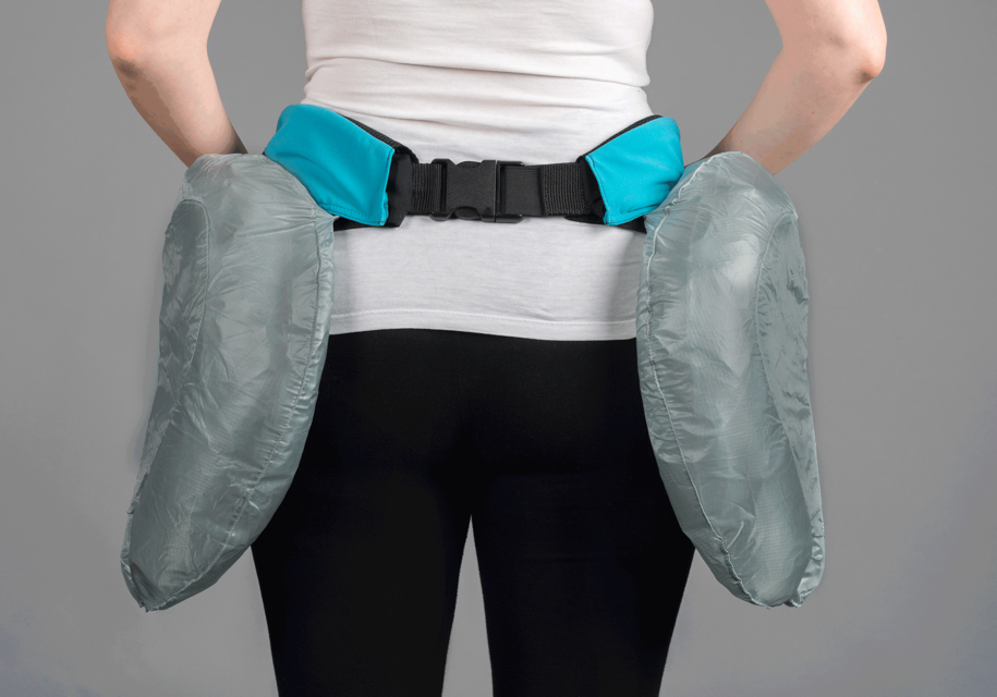 Hip’Air — это ремень из вентилируемой ткани с интегрированными подушками безопасности, акселерометрами, гироскопами, газогенератором и пластикой застежкой, выполняющей роль активатора всей системы.
