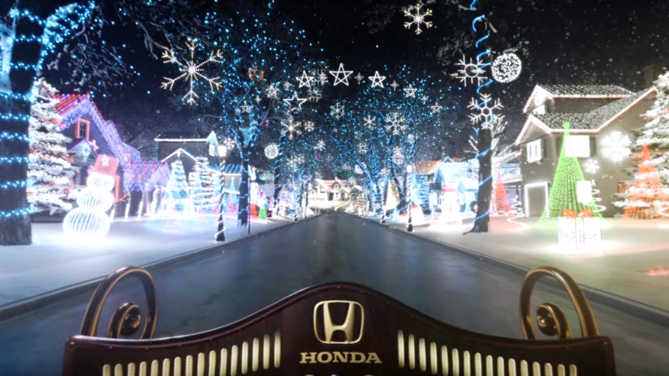 Рождественское путешествие на санях под брендом Honda было реализовано с помощью очков виртуальной реальности Oculus Rift, которые выпускает «Майкрософт». Это небольшая поездка по улице со множеством праздничных украшений (так называемая Candy Cane Lane). Видео подготовлено в формате «от первого лица».