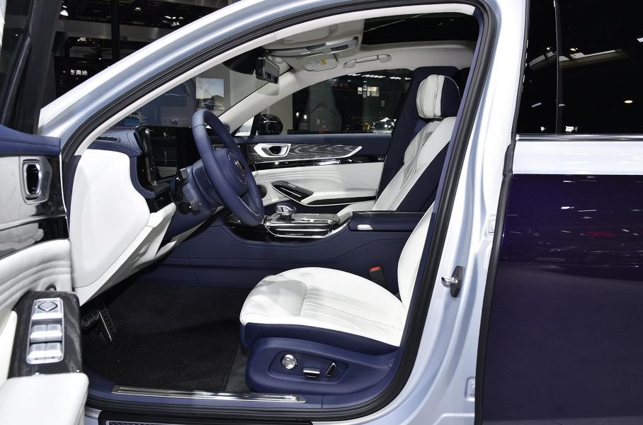 Зато в салоне Hongqi H9 образца 2024 года совсем другой. У топ-версии четыре места, высокий центральный тоннель с раздвижными столиками, в спинках передних кресел мониторы, а сиденья можно регулировать с помощью планшета — настраиваются и подушка, и спинка! Опции «премиальные»: вентиляция, подогрев и массаж доступны всем седокам, можно доплатить за проекцию, автопарковщик, самозатемнение стёкол и панораму. Передняя панель тоже поменялась: аналоговые шайбы и кнопки в прошлом.