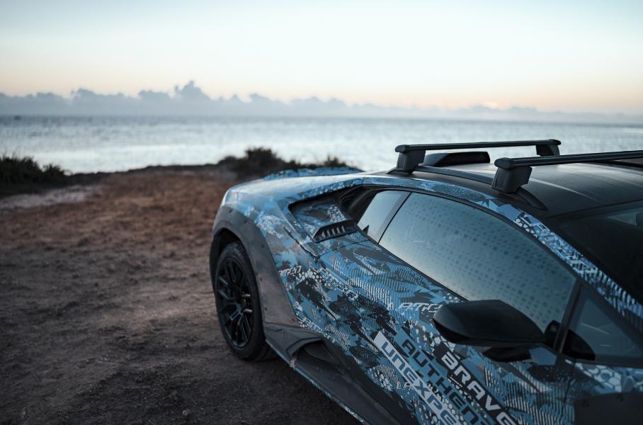 Помимо синей камуфляжной ливреи Huracan Sterrato отличается рейлингами на крыше, которые позволяют взять в поездку дополнительные вещи. Кроме того, внедорожный суперкар оборудован двумя компактными светодиодными люстрами в передней части кузова. Дорожный просвет машины увеличен на 47 миллиметров, углы въезда и съезда — на один процент и на 6,5 процента соответственно. В движение Sterrato будет приводить 5,2-литровый атмосферный V10, отдача которого составит около 630 лошадиных сил.