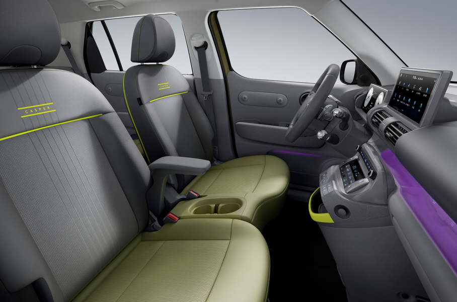 В двухцветном салоне зеленый оттенок вторит экстерьеру, а дополняют декор неоновые вставки. В остальном салон такой же, как у обычного Casper, с отдельно стоящим экраном по центру и множеством физических кнопок.