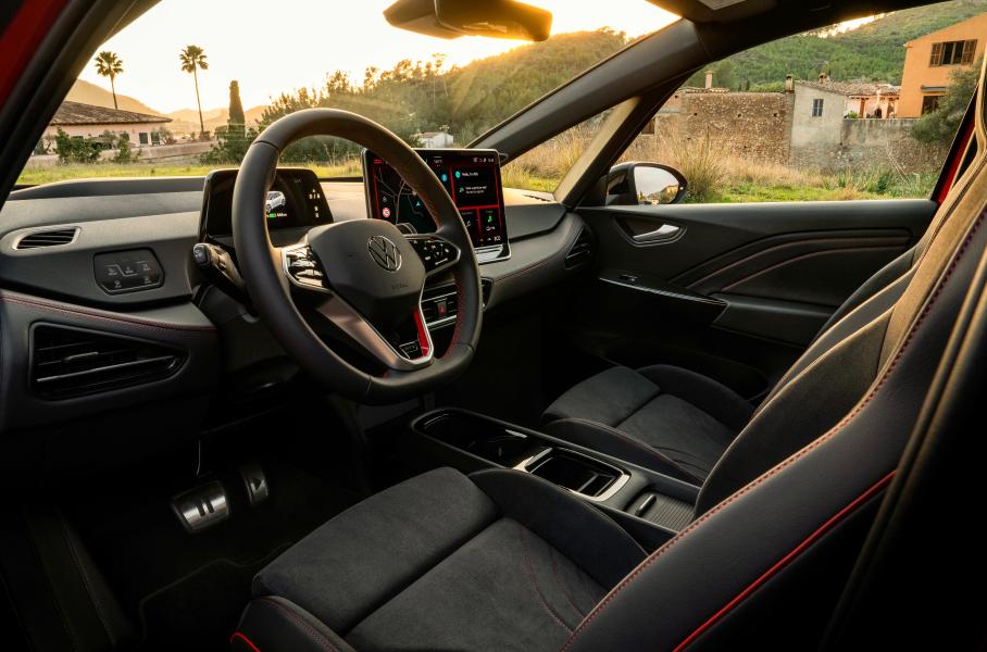 Самый мощный батарейный хот-хэтч разгоняется до «сотни» за 5,6 секундыВнешние отличия ID.3 GTX сводятся к новым бамперам с черными ромбовидными воздухозаборниками, черному глянцевому декору и заднему диффузору. В салоне же традиционная для GTX-версий черная отделка с красной строчкой и соответствующие логотипы на сиденьях и рулевом колесе. Диагональ экрана мультимедийной системы составляет 12,9 дюйма, заявлено и голосовое управление на базе ChatGPT.