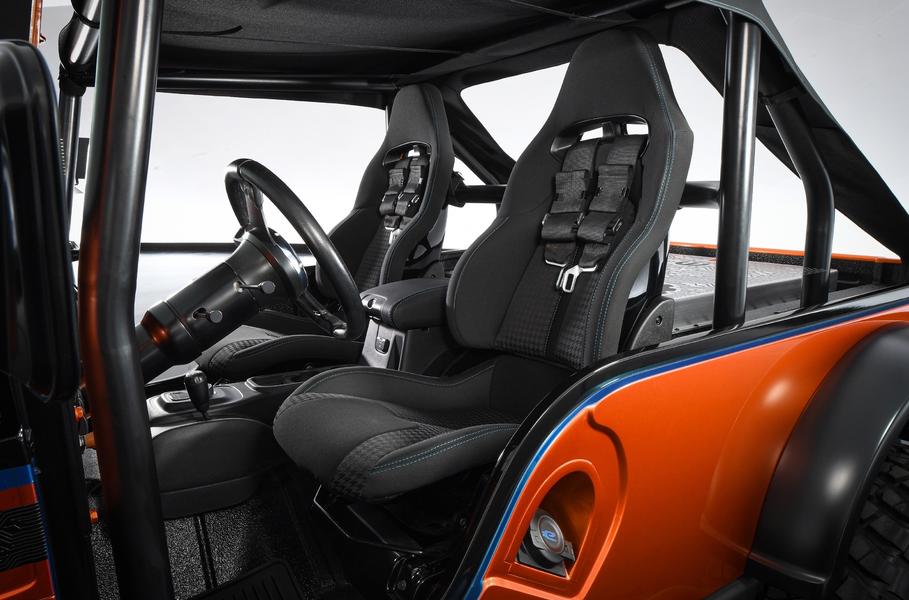 Вдобавок у концепта укорочено лобовое стекло, а центральная консоль, перекочевавшая сюда с Wrangler, снабжена поворотным селектором трансмиссии. Приборы с индикатором уровня заряда батареи — от Mopar.
