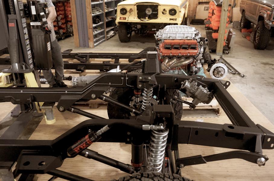 Внедорожник получил новую раму и двигатель HEMIТак как оригинальная рама «Вагонира» не приспособлена под 1000-сильные двигатели, в Vigilante 4x4 сделали новую. Для этого данные 3D-сканирования родного шасси Jeep свели в CAD-модель, которую затем доработали и уже на её основе собрали новую «тележку». Мастерская вновь использовала стальные трубы прямоугольного сечения, только толщина их стенок на два миллиметра больше, чем у исходника. Последний этап — пескоструйная обработка и нанесение защитного порошкового покрытия.