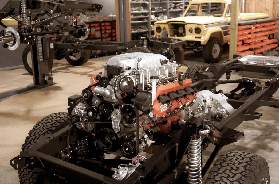Спереди и сзади у рестомода стоят мосты Dana и шестипоршневые тормоза Baer. Длинноходные койловеры Fox Racing 2.0 «по кругу» дополнены пружинами Eibach. Но главное — это всё-таки двигатели. Vigilante 4x4 предлагает современные «восьмерки» HEMI из каталога Mopar мощностью 492–1014 лошадиных сил, а также две коробки передач на выбор: шестиступенчатую «механику» Tremec TR-6060 и классический четырехдиапазонный автомат Bowler 4L80E. Полноприводная трансмиссия сохранена, но теперь схема включает двухступенчатую раздатку Advance Adapters Atlas-II в усиленном корпусе.