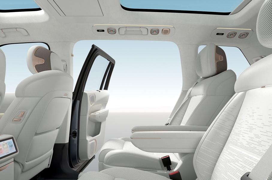 В салоне влияние Ли Сяна заметно: такой же миниатюрный экран панели приборов, такой же составной тачскрин, смещенный вправо. Диагональ мониторов — 30 дюймов, разрешение — 6К. Аналогичный дисплей доступен для задних пассажиров: он откидывается с потолка. Есть встроенный холодильник, аудиосистема Harman/Kardon с динамиками в подголовниках, у всех трех рядов электрорегулировки, второй ряд можно сдвигать в диапазоне 550 мм, третий — на 125 мм.