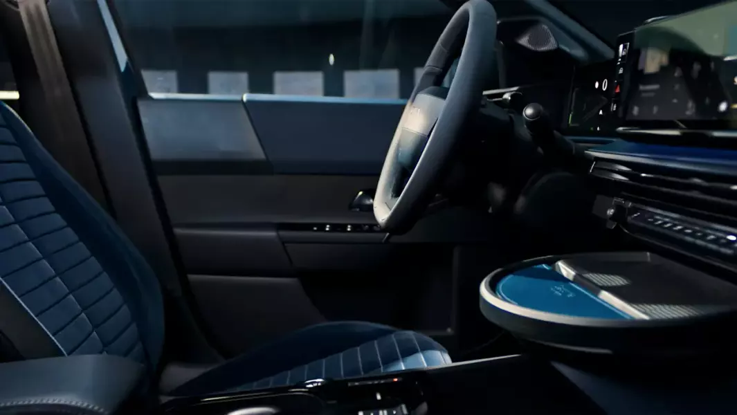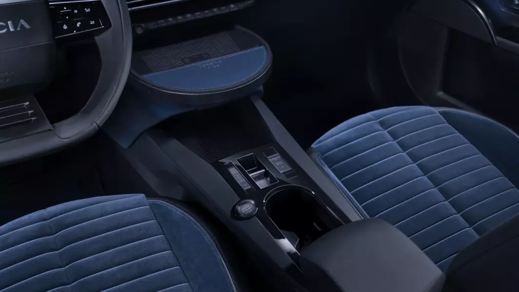 На передней панели на разных уровнях установлены два экрана — цифровая панель приборов «утоплена» чуть глубже, в то время как экран мультимедийной системы напротив выдвинут вперед. Под ним расположен блок дефлекторов климатической системы и ряд физических переключателей, но при этом селектор коробки передач и кнопка запуска двигателя расположены на центральной консоли.