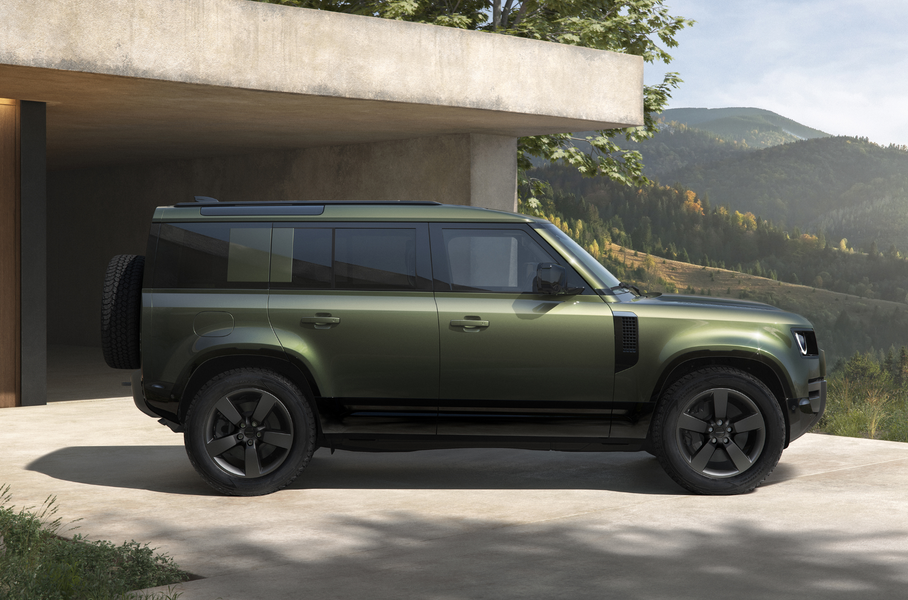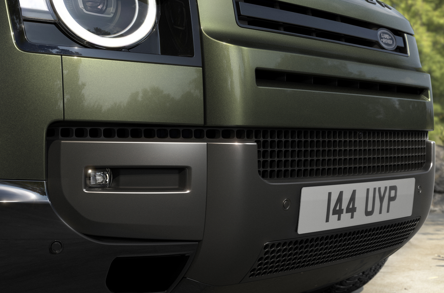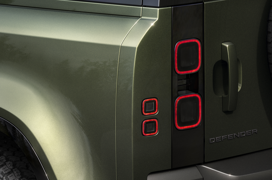 Внедорожник по-прежнему доступен в версиях 90, 110, 130, а также экстремальной OCTAФары сохранили прежнюю конструкцию — полукружия в прямоугольных блоках, — но теперь при включении они отображают фирменную графику. Противотуманки вошли в стандартное оснащение, а фонари с классическим дизайном из четырех квадратов получили затемненные линзы. Также слегка изменились бамперы, вставки на капоте и боковые вентиляционные отверстия. Изюминка обновления — глянцево-черные ступичные колпачки с надписью Defender. Они положены всем версиям, как и черная решетка радиатора с темным шильдиком.