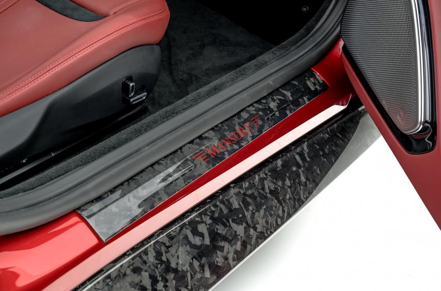 Заодно логотипы Ferrari заменят на эмблемы Mansory, поставят кованые колеса (21 дюйм спереди и 21 — сзади) и даунпайп со спортивным катализатором на 200 ячеек. Набор пружин из хромокремнистой стали сделает машину на 25 миллиметров ниже. Список аксессуаров для салона включает напольные коврики, накладки на педали, подрулевые лепестки из углепластика и подсвеченные декоративные вставки в порогах. Полная перешивка сидений, руля и дверей оговаривается отдельно.