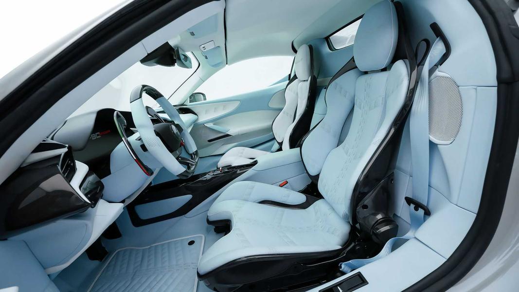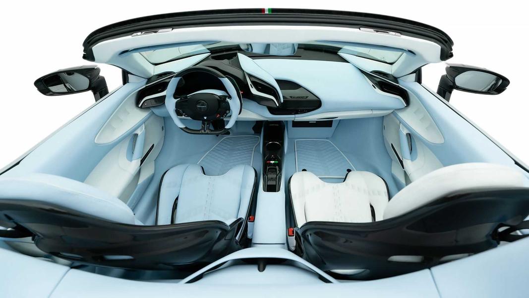 Машина получила разноразмерные — 21 и 22 дюйма спереди и сзади соответственно — колёса и обшитый от ковриков до потолка светло-голубой кожей салон. Стандартный Ferrari SF90 Spider оснащается гибридной силовой установкой, сердцем которой является V8 4.0 мощностью 780 лошадиных сил и 800 Нм момента — его дополняют три электромотора суммарной отдачей 220 сил.