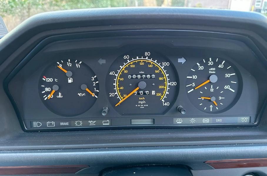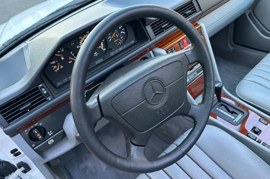 С 1995 года белый Mercedes-Benz преодолел всего 9763 мили (эквивалент 15,7 тысячи километров), и мизерному пробегу соответствует состояние кузова, днища и салона. Есть документы, подтверждающие безаварийную историю, и отчёты о дилерском обслуживании. О «гаражном» статусе седана напоминают шины Pirelli, выпущенные в прошлом веке.