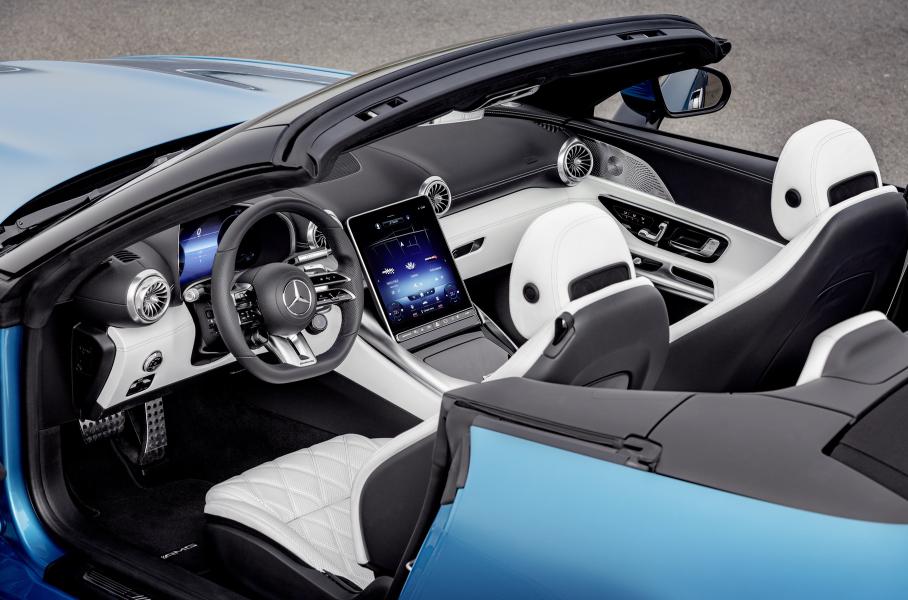 Посадочная формула нового SL — 2+2. Однако второй ряд чисто номинальный: там поместятся пассажиры ростом не больше 150 сантиметров, поэтому чаще его будут использовать для багажа. SL 43 стандартно оснащен цифровой «приборкой», комплексом MBUX с сенсорным дисплеем, сиденьями с электрорегулировкой, а также пассивной пружинной подвеской. В списке опций — полноуправляемое шасси, дифференциал с электронным управлением в задней оси, композитные тормоза, уменьшение дорожного просвета на десять миллиметров и различные варианты декоративной отделки салона, в том числе по программе manufaktur.
