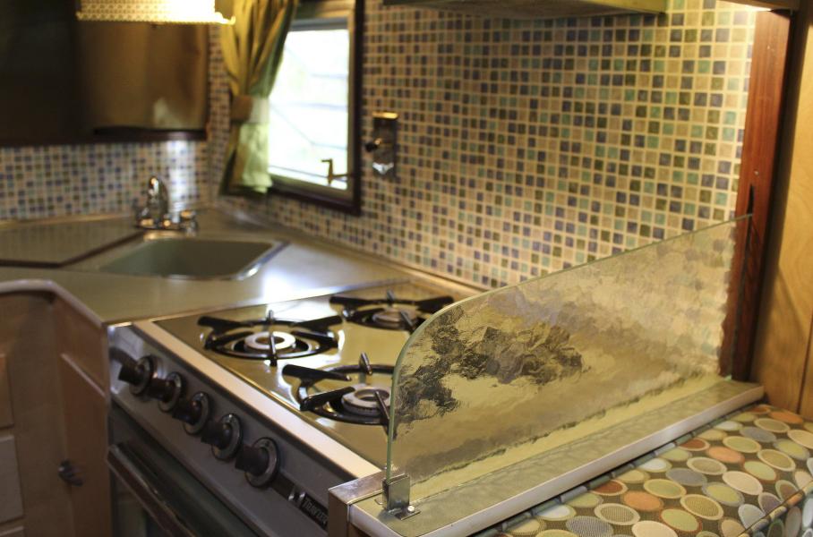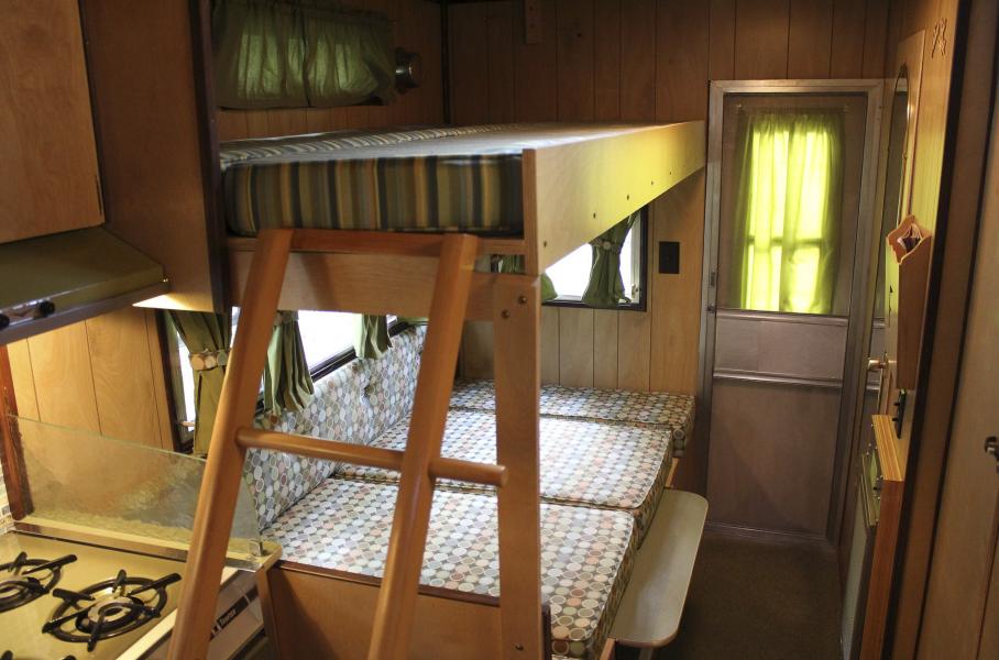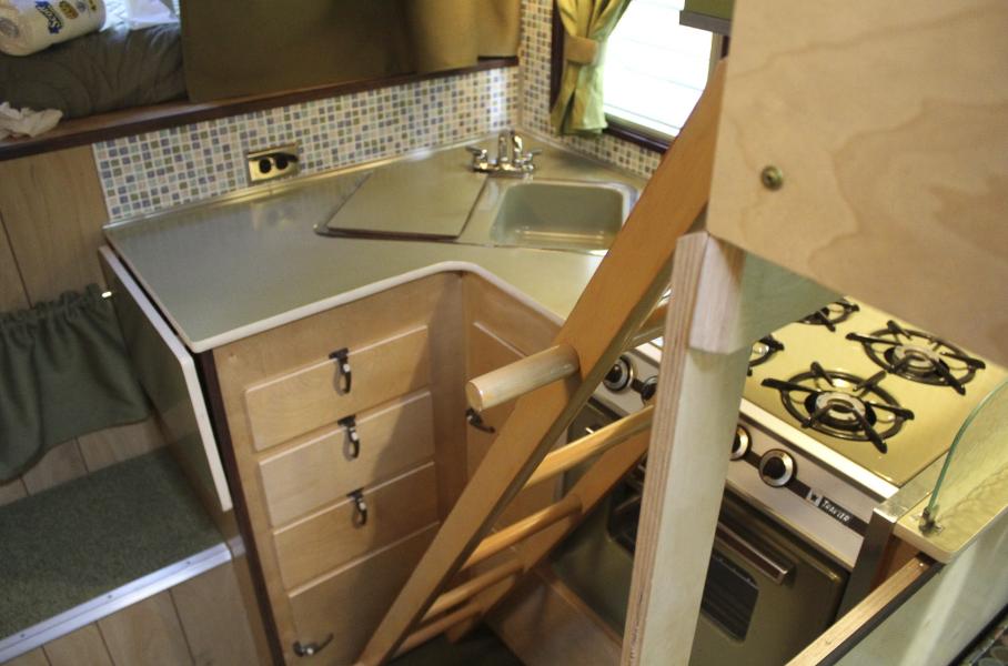 Жилое пространство внутри отделано натуральным деревом, имеется полноценная кухонная зона с раковиной, плитой с четырьмя конфорками и духовкой. Справа от нее – U-образный диван со столиком, который трансформируется в кровать для двоих. Еще одно спальное место имеется над ней, а третье расположено над водительской кабиной. Можно залезть на крышу и принять солнечные ванны – для этого сзади имеется лестница. Также внутри уместили душевую с туалетом и различные кармашки и ящики для хранения.