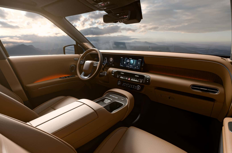Центральный подлокотник можно поднять, чтобы создать еще одно место: таким образом, Palisade сможет перевозить до девяти человек. Эмблема Hyundai на руле, позаимствованном у Santa Fe, заменена на четыре точки, обозначающие литеру H в азбуке Морзе. Также новинке достались круглые дверные ручки и мягкая атмосферная подсветка.