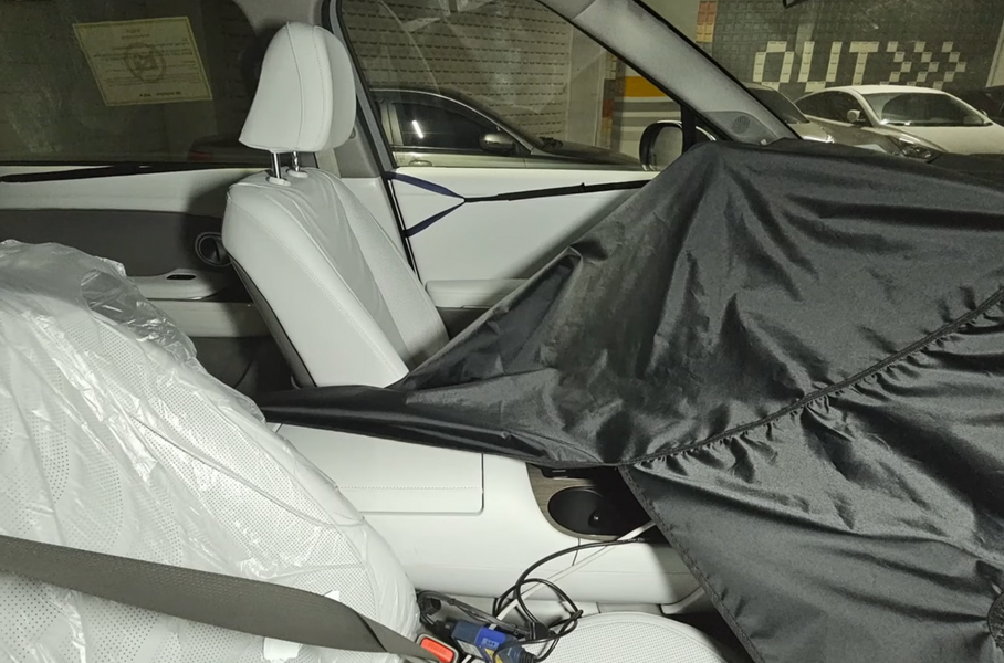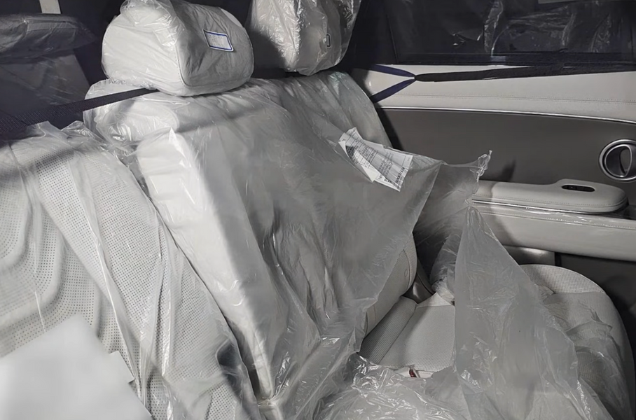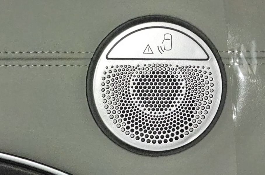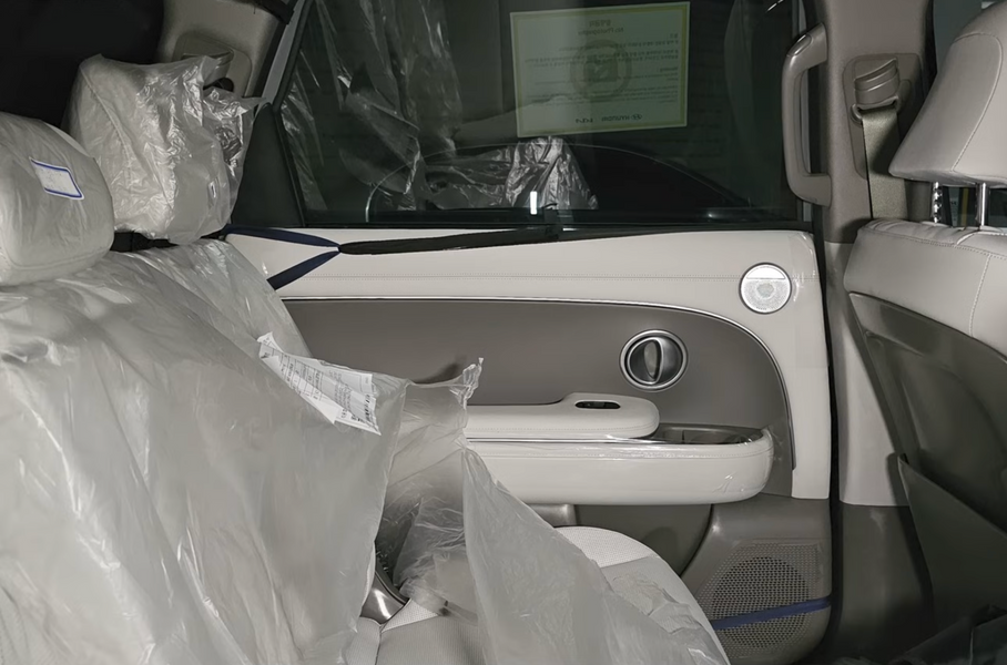 Шпионы также смогли заглянуть внутрь прототипа. Передняя часть интерьера скрыта, однако сиденья и детали отделки видны. В их числе — дверные карты с круглыми ручками и круглыми динамиками, глянцевая панель с кнопками на потолке, перфорированная кожа и деревянные вставки.