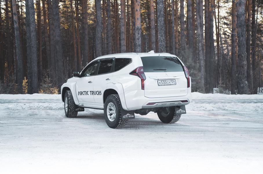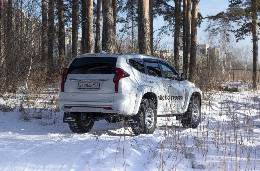Если размерность шин у стандартного Pajero Sport составляет 265/60/R18, то Arctic Trucks устанавливает покрышки 315/70 R17. Доработанный внедорожник на 18,5 сантиметра шире обычного и на 6,5 сантиметра выше, а клиренс увеличен с 218 до 270 миллиметров. Угол въезда тюнингованного Pajero Sport составляет 34,5 градуса против 30 градусов у стандартного, а угол съезда — 28,8 против 24,2. На то, что внедорожник был подготовлен Arctic Trucks, указывают логотипы компании на брызговиках, наклейки на кузове и эмблема на пятой двери.