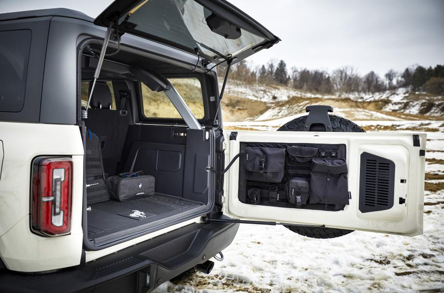 Салон внедорожника выполнен в черно-белой гамме, которую дополняют элементы красного цвета. В числе других доработок Bronco получил дополнительное освещения на крыше, запасные трубчатые двери из фирменного каталога Genuine Ford Accessories, систему крючков Molle для крепления груза, а также сейф.