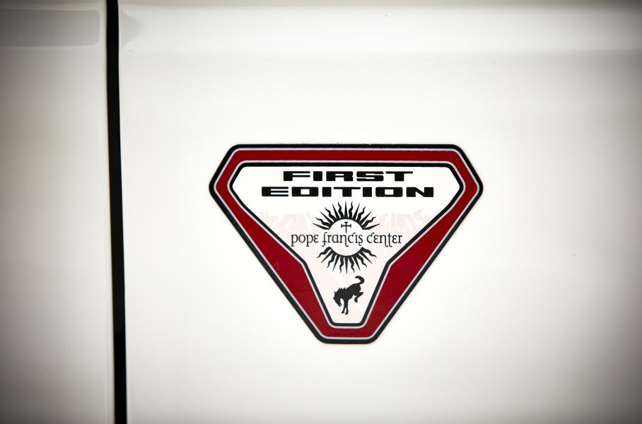 Вырученные средства с продажи внедорожника направят на благотворительностьЭксклюзивный Bronco представляет собой модифицированный внедорожник, построенный на базе исполнения First Edition. Кузов автомобиля окрашен в классический белый цвет Wimbledon White, который отсутствует в палитре актуальной модели, но предлагался для классического «Бронко». Кроме того, внедорожник оборудован белыми колесами Detroit Steel Wheels, серебристой радиаторной решеткой и силовым модульным бампером Ford Performance. По всему кузову модели специалисты добавили красные акценты, а также украсили Bronco эмблемами с надписями First Edition и Pope Francis Center.
