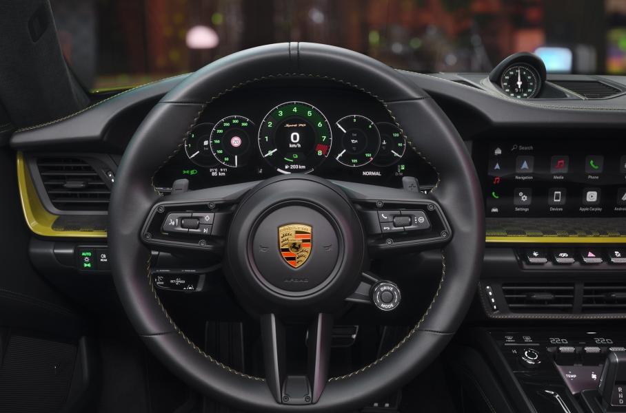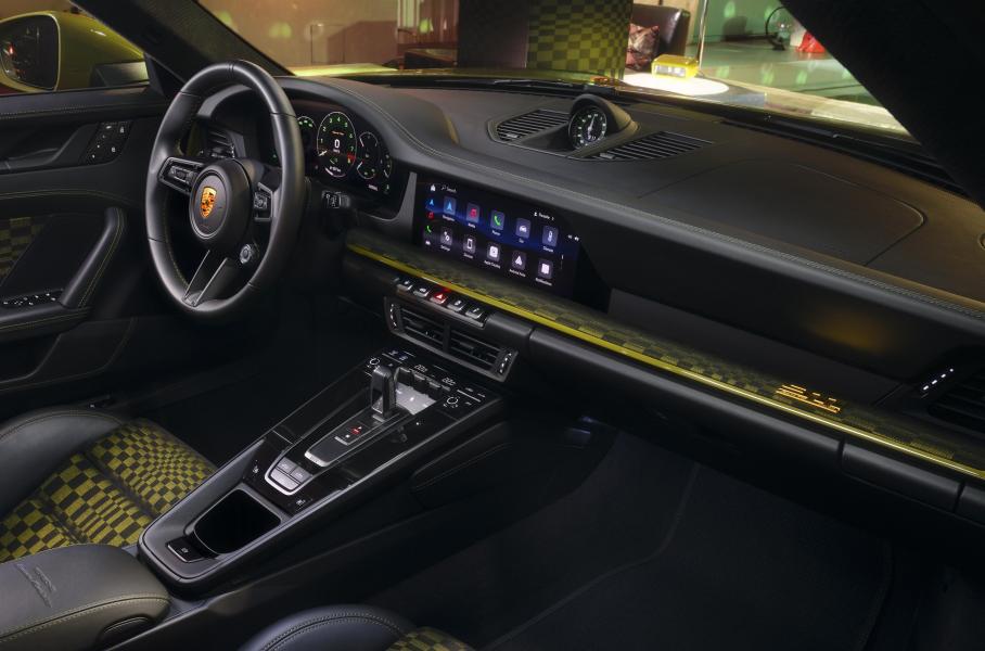Декоративная графика на капоте тоже служит отсылкой к прошлому — в те времена продольные полосы наносили, чтобы быстрые машины было легче разглядеть в зеркале заднего вида. Также 911 Spirit 70 достались винтажные логотипы и позолоченные надписи на корме. Внутри — спортивные сиденья Plus с электрорегулировками в 18 направлениях и цифровая «приборка» с интерфейсом «под ретро». Стрелки и шкалы здесь аналоговые, а зеленые цифры напоминают о легендарном Porsche 356.